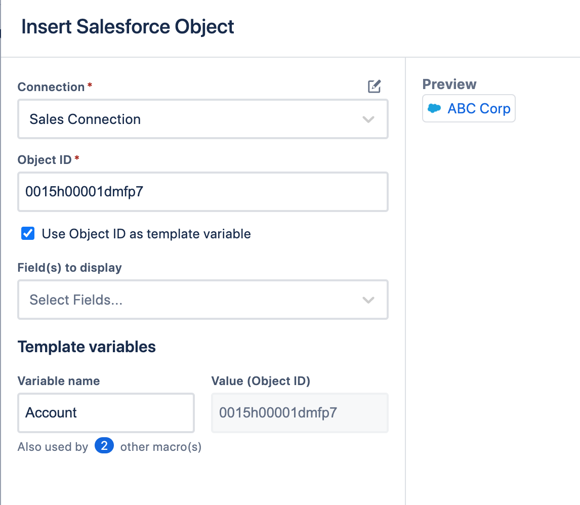 Select the option to **use Object ID as a template variable** when defining Salesforce Object Macro. Enter **Account** for variable name.