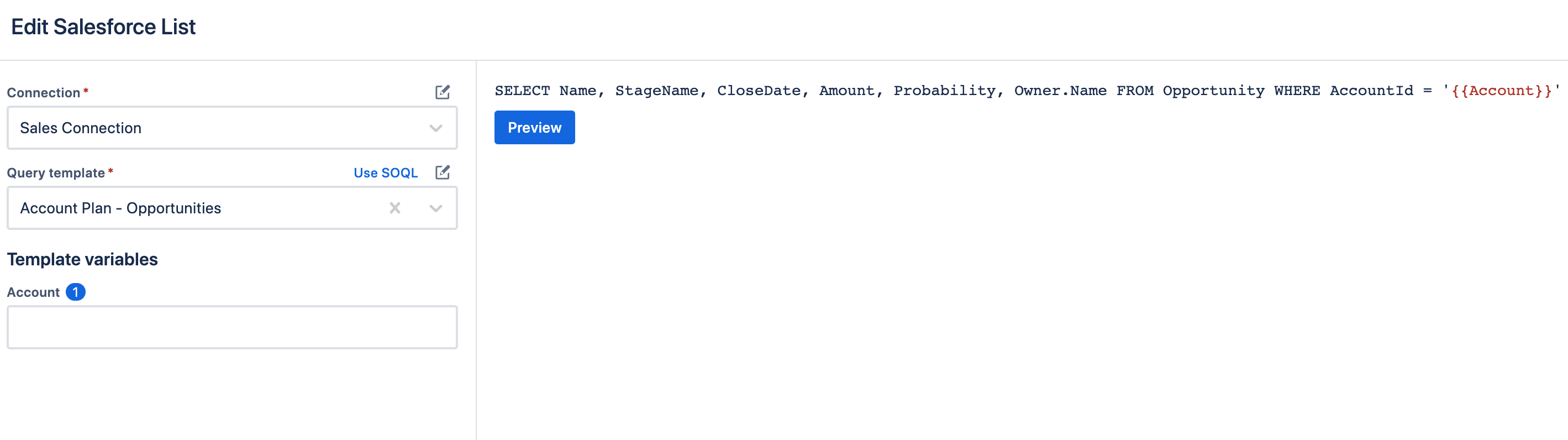 In the image above, a Query Template is defined to find Opportunities based on the matching AccountId. Notice the template variable **{{Account}}**.